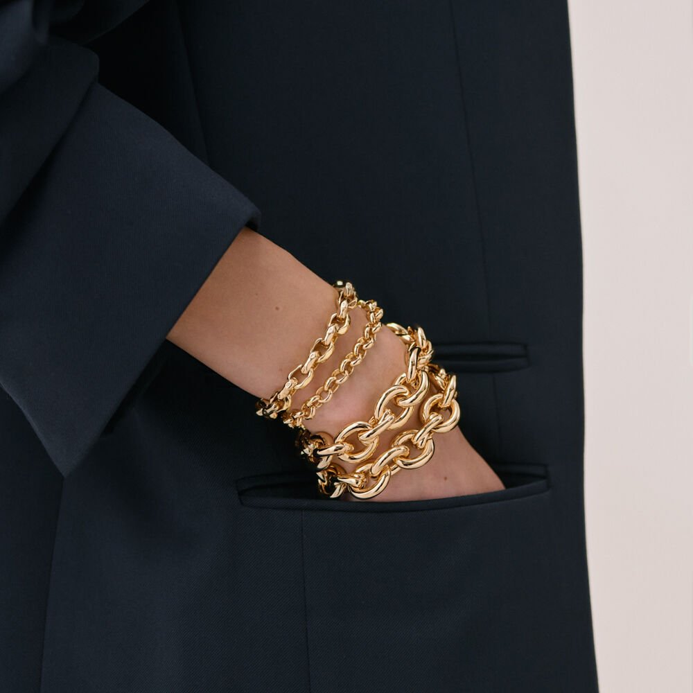 Bracelet maille en laiton doré à l’or 750/1000. Une maille avec de gros anneaux dont un en forme de X ainsi qu’un fermoir T-barre. .