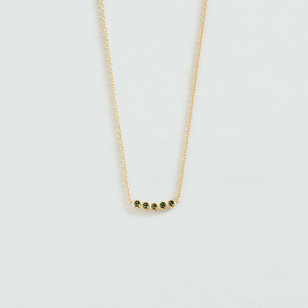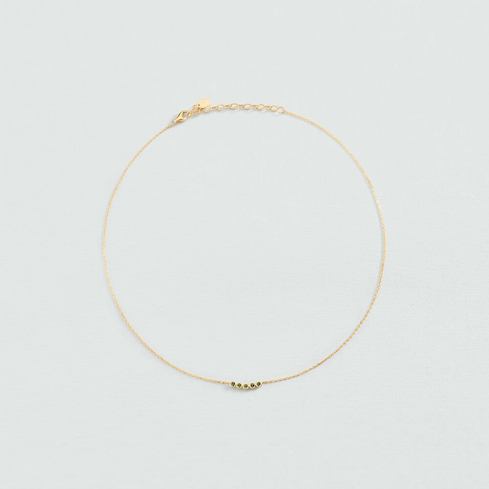 Collier de notre collection ODEON, imaginé à Paris, réalisé en argent 925 doré à l’or 750/1000e – 18 carats et orné d’oxydes de zirconium ou de spinelle synthétique, en sertis clos . Il est disponible en couleur cristal ou vert. Cette collection au design épuré est inspirée des codes classiques de la joaillerie. Ce bijou mesure 375 mm auquel s’ajoute une rallonge de 50 mm